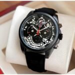 The strong black matte finish case paired with a durable black rubber strap ensures long-lasting comfort and rugged durability. The skeleton dial with contrasting markers and red chronograph hand adds a dynamic and masculine appeal, making it a perfect choice for modern men.